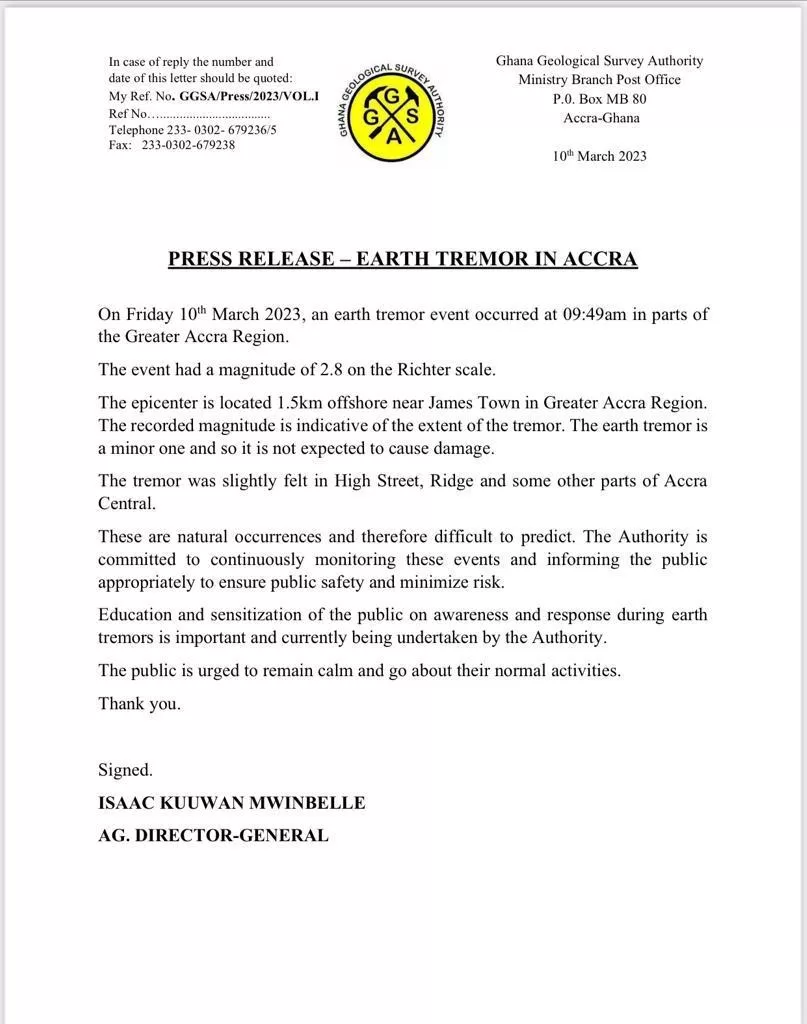 “The earth tremor is a minor one and so it is not expected to cause damage,” the Authority said in a statement signed by Isaac Kuuwan Mwinbelle, AG. Director-General.