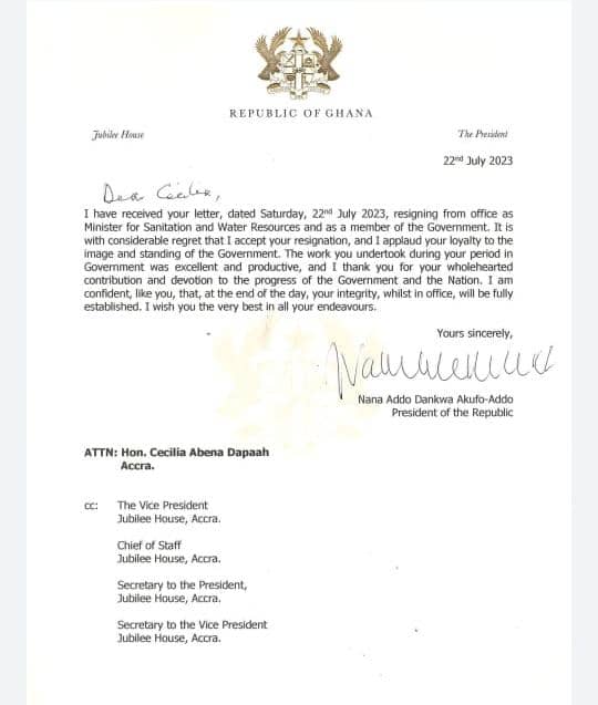 President Akufo-Addo in his acceptance to the resignation of madam Cecilia Dapaah applauded her for the loyalty in protecting the image of his government.
