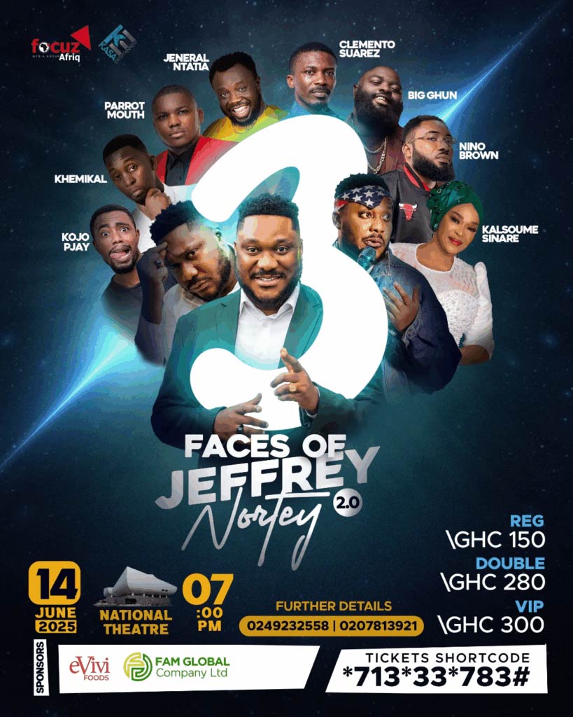 Accra’s National Theatre will come alive on Saturday, June 14, 2025 at 7 PM when Jeffrey Nortey brings his flagship production, 3 Faces of Jeffrey Nortey, to the heart of the city.