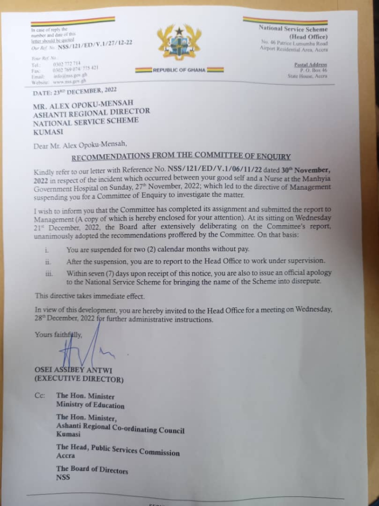 The letter was dated 23rd December 2022 and was signed by Mr. Osei Assibey Antwi, Executive Director of the National Service Scheme. It was copied to the Minister of Education, the Ashanti Regional Minister, the Head of Public Service Commission and the Board of Directors.