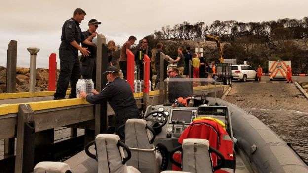 Local media also reported a further death in Victoria. The deaths brings the total of fire-related fatalities across Australia this season to at least 18, with warnings this could rise. Of the homes destroyed, 43 were in East Gippsland, Victoria, while another 176 were in New South Wales. Earlier on Wednesday, New South Wales Rural Fire Service said 916 homes had been destroyed this season, with another 363 damaged, and 8,159 saved. In Mallacoota, Victoria – where thousands fled to the beach on Tuesday – police boats arrived with 1.6 tonnes of water for residents. They also brought food, a paramedic and medical supplies. At the same time, police warned people in Sunbury, Victoria – around 40km (25 miles) north-west of Melbourne – to leave the area, as an emergency fire warning was in place. Earlier, New South Wales Premier Gladys Berejiklian said workers would take advantage of the milder weather on Wednesday to clear roads and restore power. But she said temperatures were expected to rise again on Saturday. “At the very least, weather conditions will be at least as bad as what they were yesterday,” she said. The fire service warned they had been unable to reach some people in remote areas. “We’ve got reports of injuries and burn injuries to members of the public,” said New South Wales rural fire commissioner Shane Fitzsimmons. “We haven’t been able to get access via roads or via aircraft – it’s been socked in [runways have been closed] or too dangerous.”