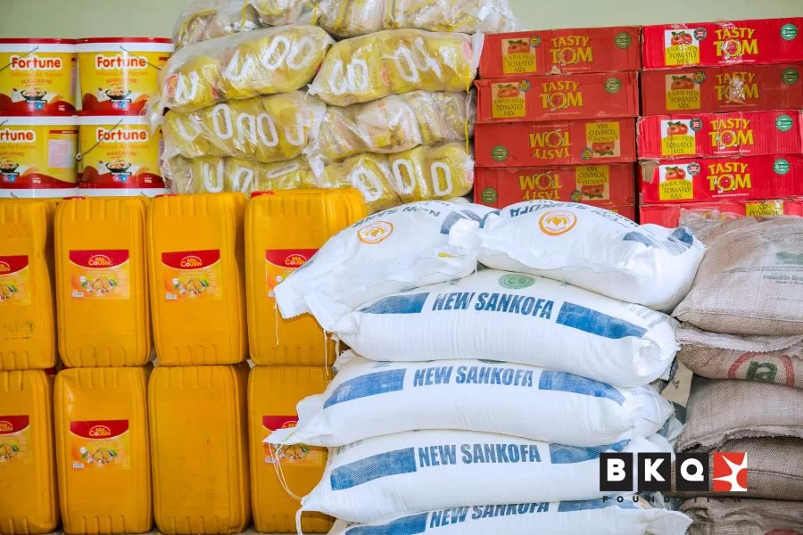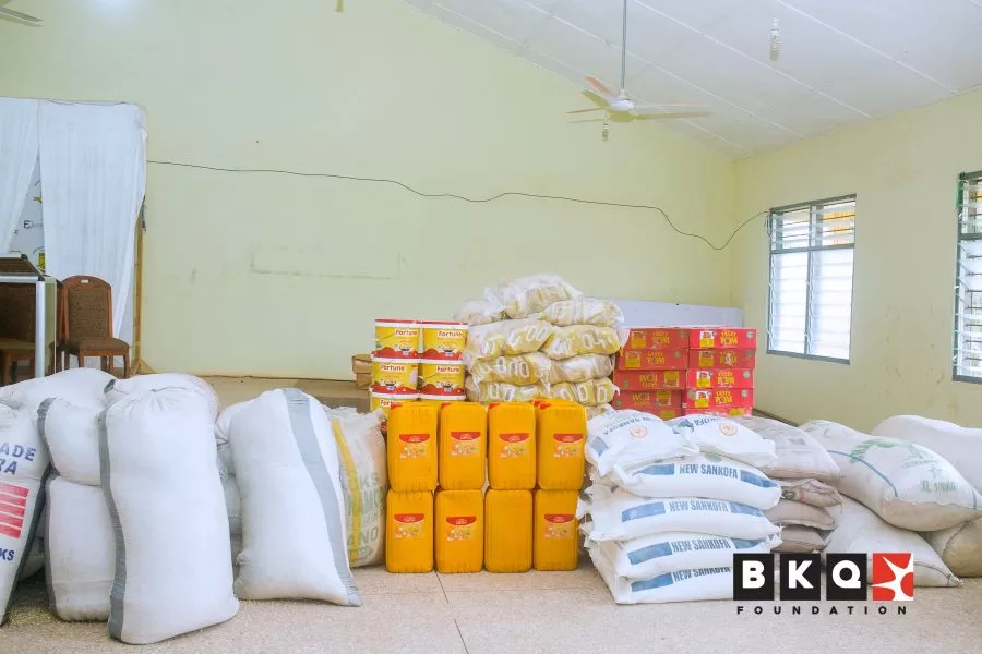 The BKQ Foundation donated various items including 20 bags of 25kg rice, 10 gallons of 25 litre vegetable cooking oil, 20 boxes of tomato paste, 5 sacks of 50kg sugar, 10 buckets of 10kg margarine, 10 bags of Sankofa flour, 10 bags of 180kg maize, 6 bags of 100kg beans and 5 bags of 150kg gari and some cash donation.