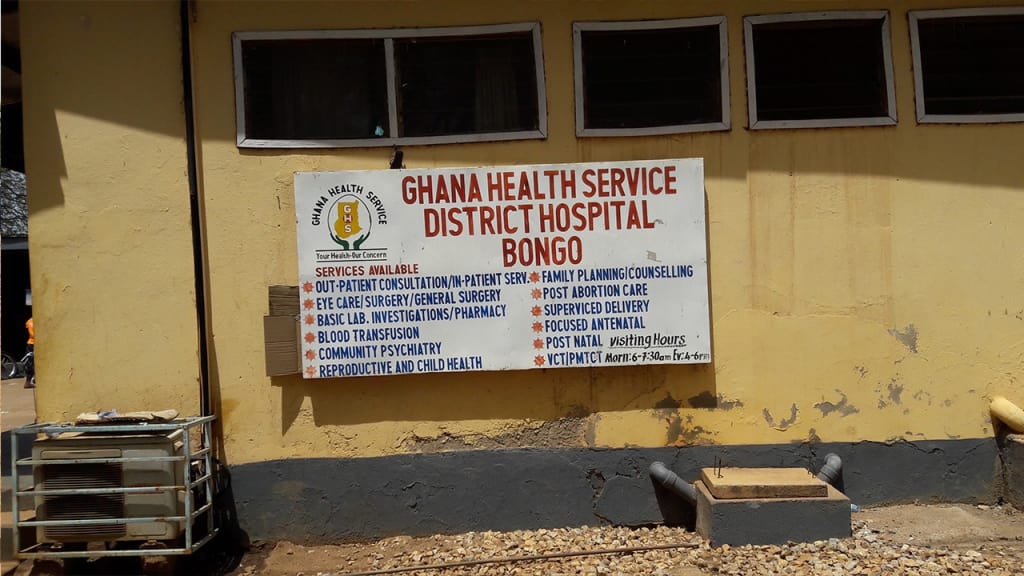 Bongo District Hospital is a 76 bed capacity facility serving 134 communities. The facility has over 200 staff (2 doctors, 21 midwives and other professionals), with an average of 150 cases a day; 10 deliveries and 2 caesarian section procedure daily. Four sub districts refer cases to the hospital.