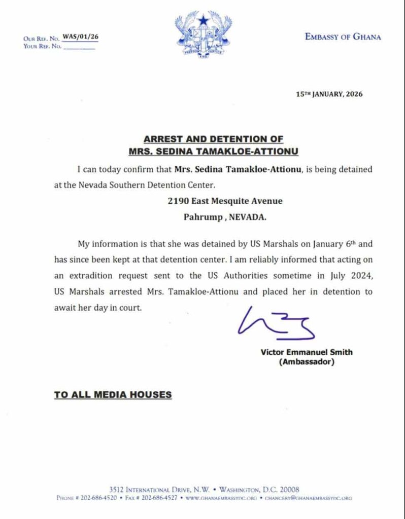 In an official statement issued to media houses, the ambassador said Tamakloe-Attionu is currently being held at the Nevada Southern Detention Center in Pahrump, Nevada. According to the statement, she was arrested by United States Marshals on January 6, 2026, and has remained in custody since then.