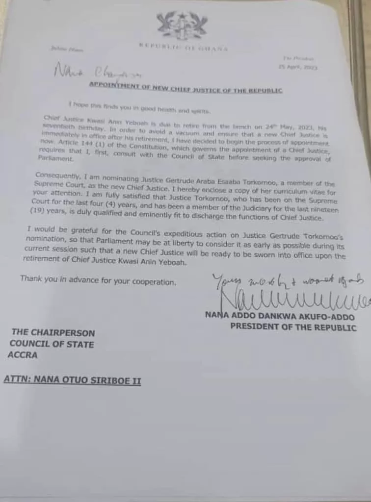 “Consequently, I am nominating Justice Gertrude Araba Esaaba Torkornoo, a member of the Supreme Court, as the new Chief Justice,” the president stated in the letter to the Chairman of the Council of State, Nana Otuo Siriboe II.