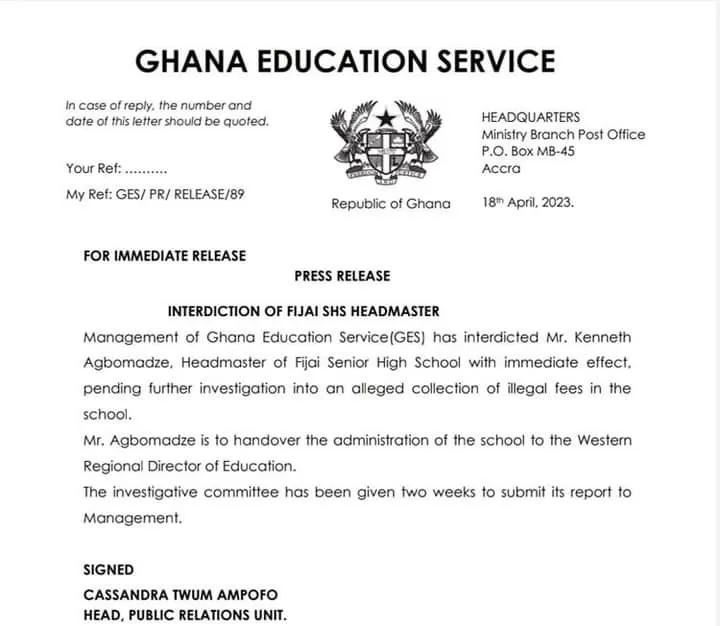 The Headmaster of Fijai Senior High School has been interdicted by the Ghana Education Service for an alleged misconduct.