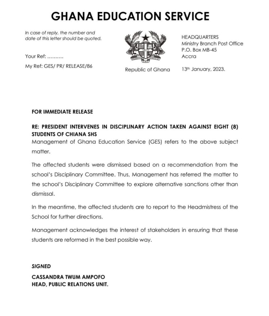 The GES have subsequently issued a press release acknowledging the president’s intervention as well as disclosing that the decision to dismiss the girls was recommended by the school’s disciplinary committee.