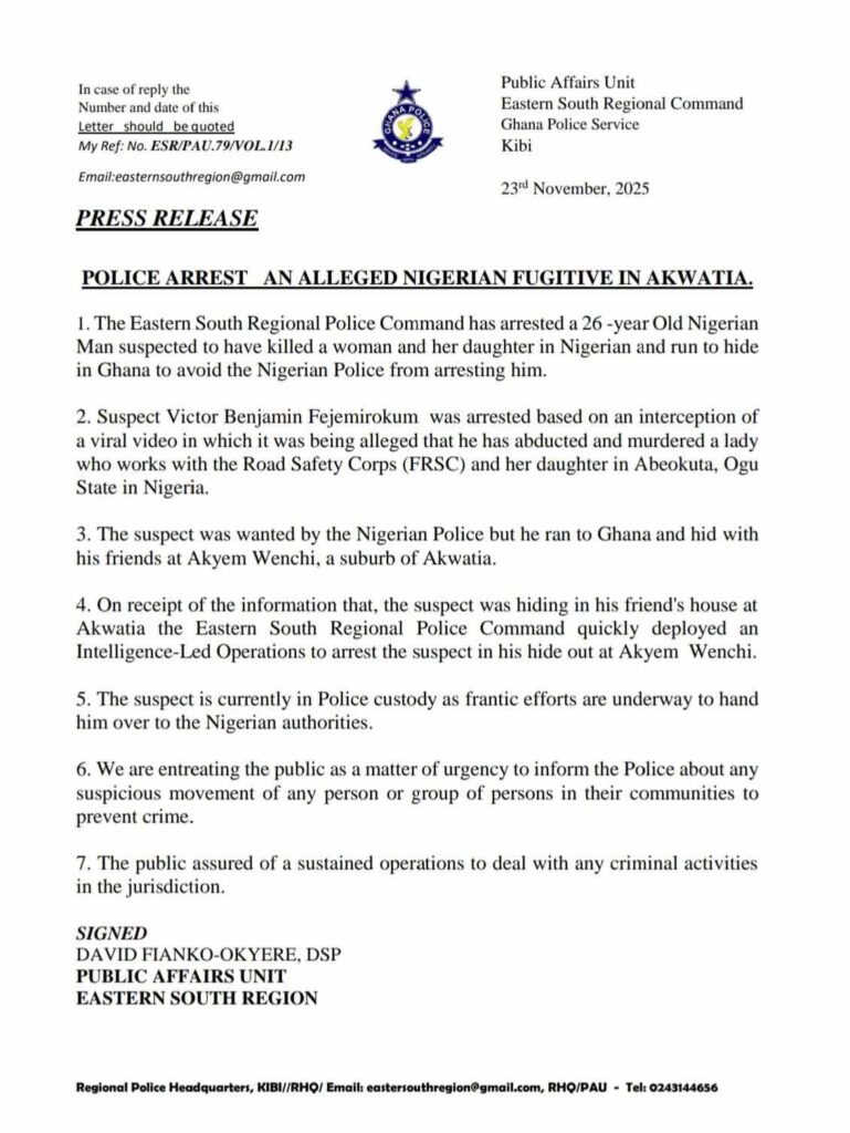According to police, Fejemirokum fled Nigeria to evade arrest and sought refuge at a friend’s residence in Ghana. Following intelligence that he was hiding in Akwatia, officers launched an intelligence-led operation that resulted in his swift arrest.