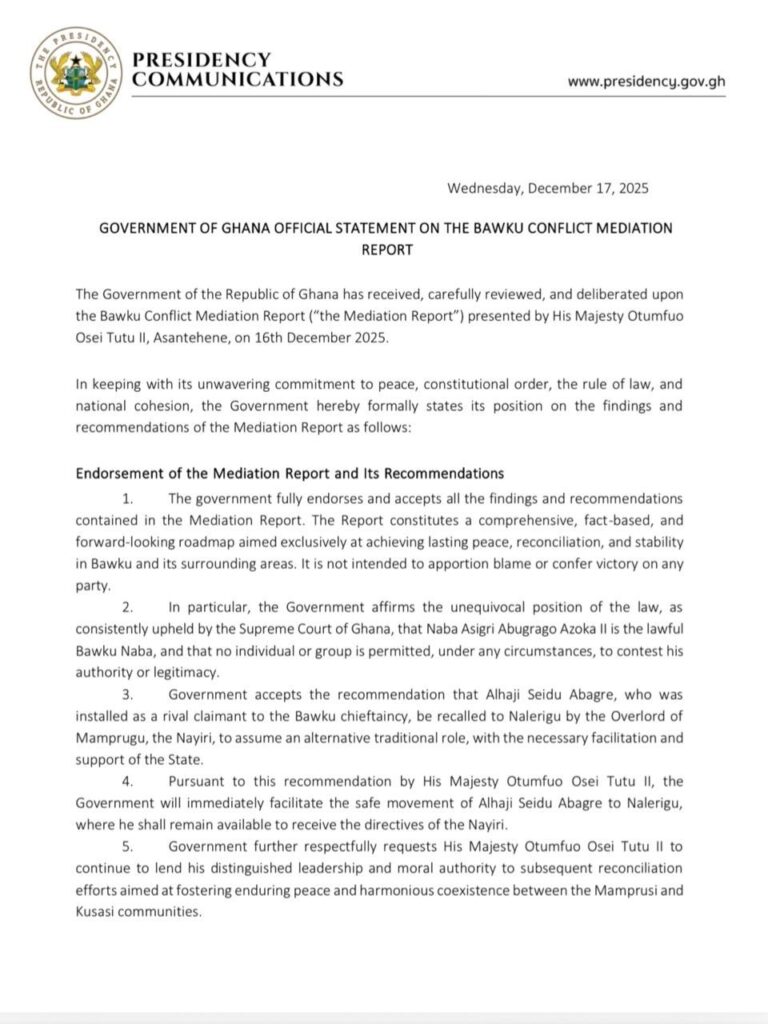 The statement expressed gratitude to Otumfuo Osei Tutu II, the Nayiri, the Bawku Naba and all stakeholders whose cooperation contributed to what the government described as a historic mediation effort.