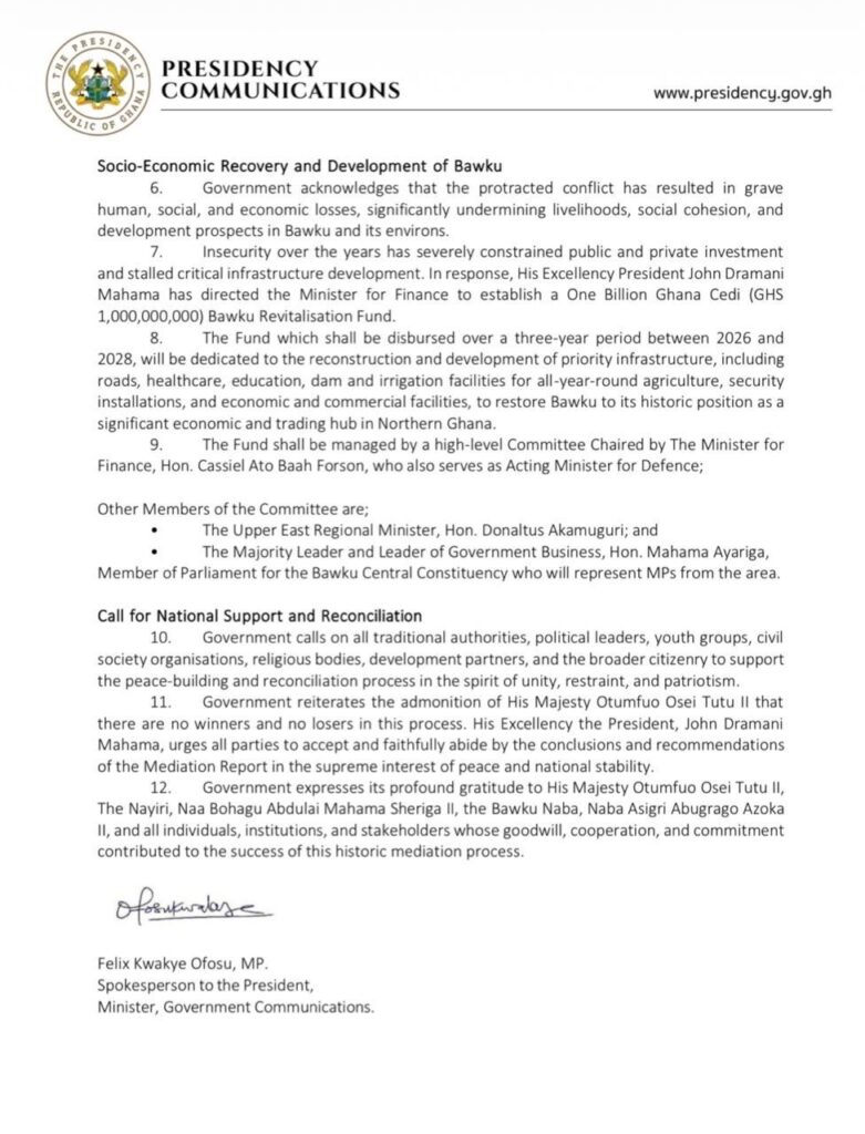 The government called on traditional authorities, political leaders, youth groups, civil society organisations, religious bodies and development partners to support the peace process in a spirit of unity and restraint. It echoed Otumfuo Osei Tutu II’s message that there are no winners or losers and urged all parties to faithfully implement the mediation report in the national interest.