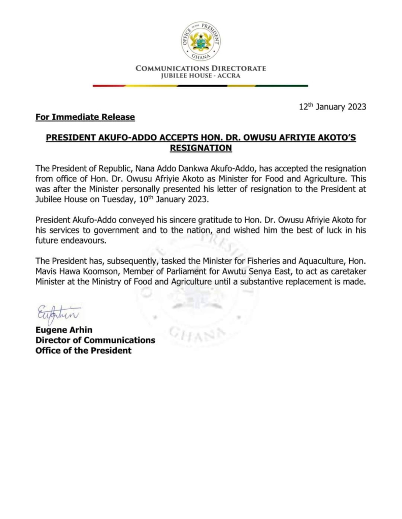 Giving further details about Dr. Afriyie Akoto’s resignation, Mr. Arhin noted that the Minister personally presented his letter of resignation to the President at Jubilee House on Tuesday, 10th January, 2023