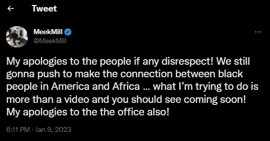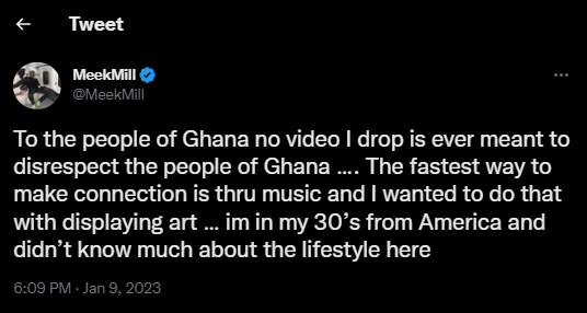 American rapper Meek Mill has apologised for the viral music video he shot at Ghana’s presidency which critics say puts the highest office of the land in bad light.