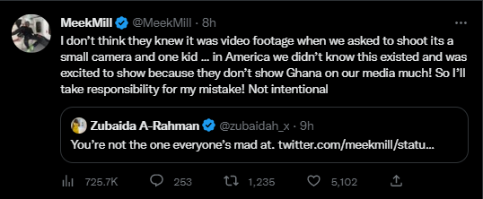 Meek Mill responding to one Zubaida A-Rahman who said he is “not the one everyone’s mad at,” explained that the officials at the presidential palace that fateful day when the video was taken did not know “it was [a] video footage when we asked to shoot. [What we used was] a small camera and one kid [shot it].”