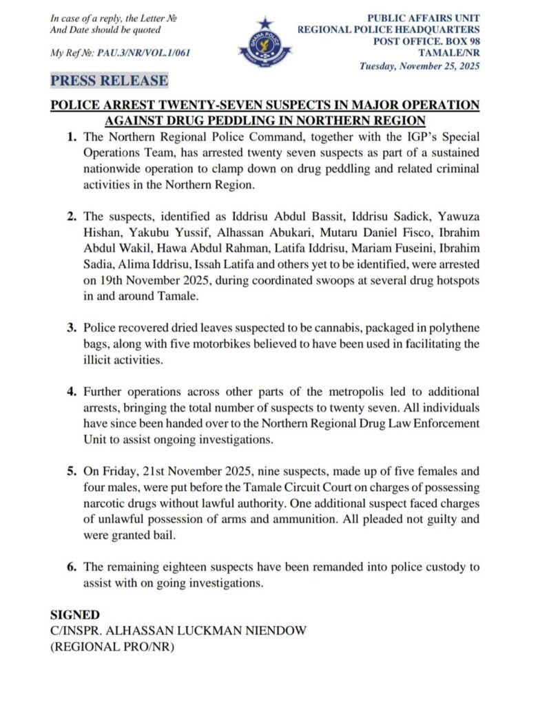 Police in the Northern Region have arrested 27 people in a sweeping operation targeting drug peddling and related crimes, authorities said Wednesday.