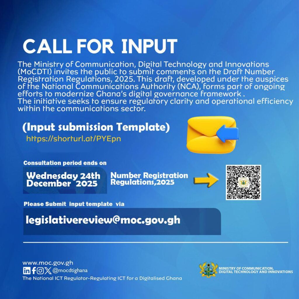 The Ministry of Communication, Digital Technology and Innovations has invited the public to submit comments on the Draft Number Registration Regulations, 2025, as part of efforts to strengthen Ghana’s digital governance framework.