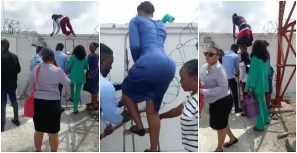 A widely shared video showing staff members at a Nigerian bank using a ladder to climb over a security wall to escape irate customers is genuine, the BBC’s Disinformation team has found.