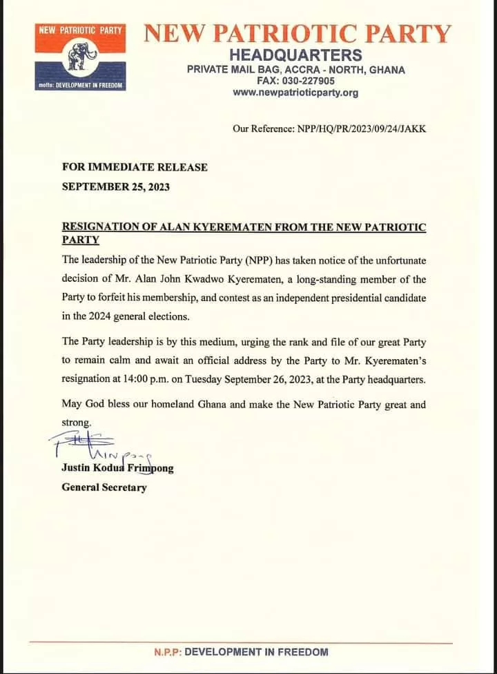 “The leadership of the New Patriotic Party (NPP) has taken notice of the unfortunate decision of Mr. Alan John Kwadwo Kyerematen, a long-standing member of the Party to forfeit his membership and contest as an independent presidential candidate in the 2024 general elections.”