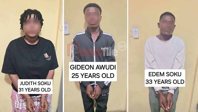 The suspects were identified as Gideon Awudi, 25, Edem Soku, 33, and Judith Soku, 31.