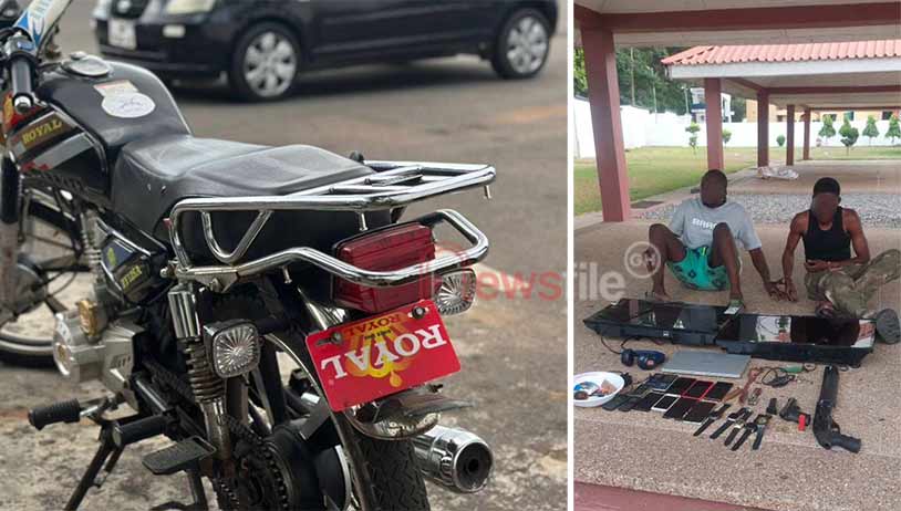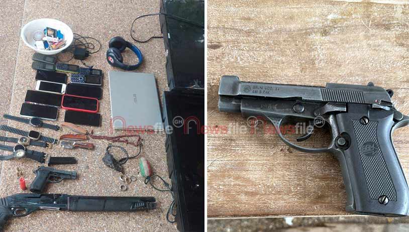 Further intelligence led officers to Kasoa Ofankor, where Selasie Emmanuel and Sulemana Osman were arrested at their hideout. A search uncovered a pump-action gun, a Bruni pistol, a BB cartridge and three rounds of ammunition.