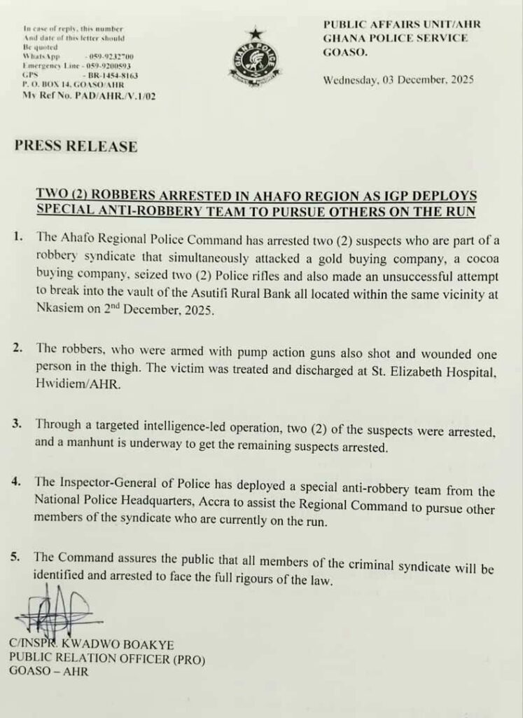 The Ahafo Regional Police Command has arrested two men believed to be part of a robbery syndicate that launched coordinated attacks on multiple businesses in Nkasiem on December 2, 2025.