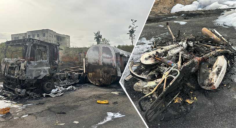 Police said six vehicles and four motorcycles were engulfed in flames. Two unidentified male bodies were found charred at the scene, while another body was discovered inside one of the burnt vehicles. Four injured victims were rushed to nearby medical facilities for treatment.