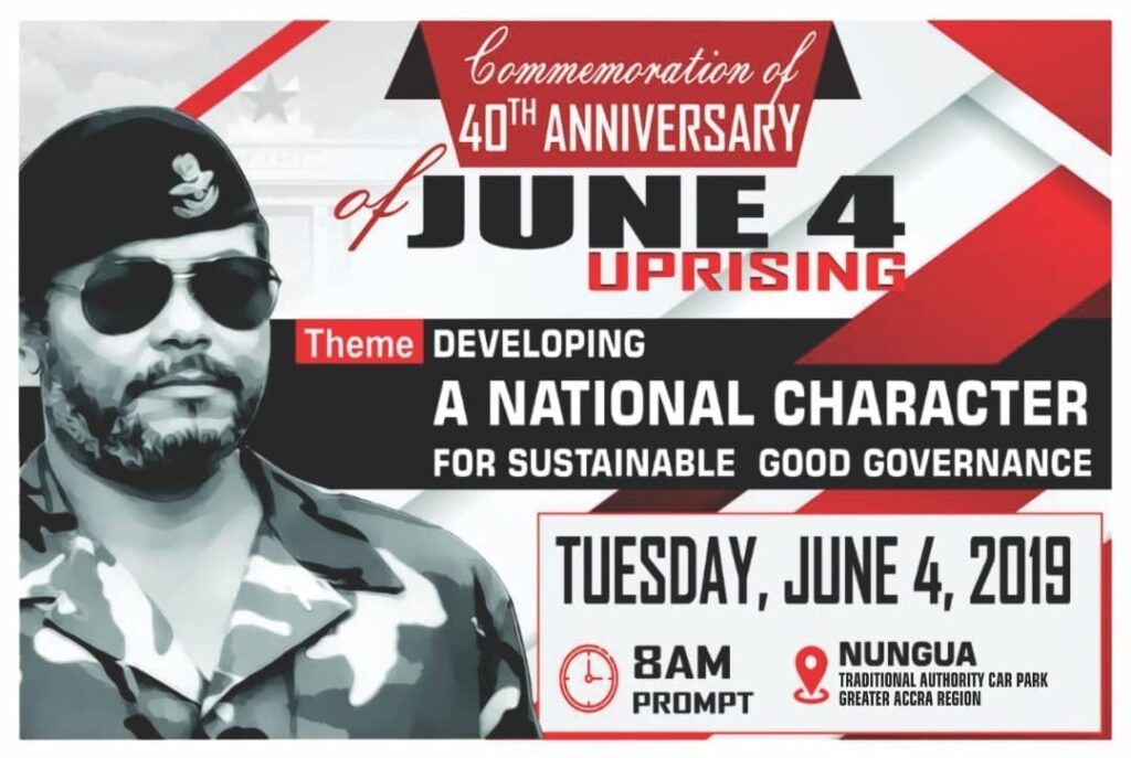 Former President Jerry John Rawlings and other leading members of the June 4 uprising will on Tuesday address a grand durbar of chiefs and people at the Nungua Traditional Authority Park, to mark the 40th anniversary of the 1979 uprising. According to the anniversary planning committee of the durbar, which commences at 8.30am will commence with a parade of young cadres, followed by a wreath-laying ceremony for the departed heroes after which solidarity messages will be delivered by a host of dignitaries including NDC General Secretary, Johnson Asiedu Nketia and cadre, Eric Bortey. This year’s celebrations have been under the theme, “Developing a national character for sustainable good governance”, and has already seen two commemorative events – a tree planting exercise on Saturday May 25 and an anniversary lecture delivered by Professor John Bright Aheto at the University of Ghana Business School on Wednesday May 29. The celebrations are also being observed across the country with lectures and durbars at various local venues. The organizing committee is also inviting all cadres, sympathisers of the revolution and the general public to Tuesday’s event at Nungua. Source: 3news.com | Ghana]]>