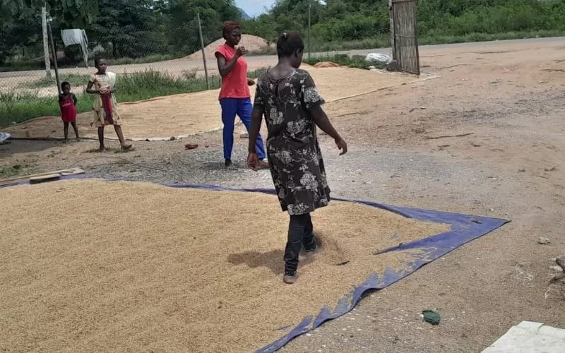 Rice farmers at Akuse near Somanya in the Eastern Region, are compelled to use their feet to dry rice due to lack of mechanical dryers.