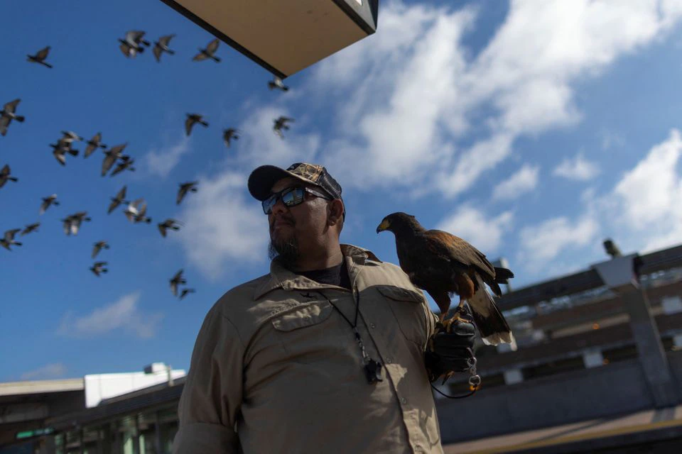 Ricky Ortiz, a falconer with Falcon Force and Pac-Man’s handler, began patrolling with the bird at the station this summer, contracting with the Bay Area Rapid Transit system, or BART, to keep the pigeons at bay and protect commuters from pigeon poop.