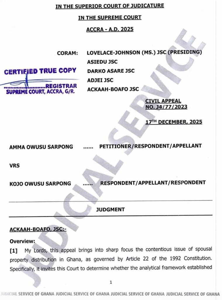 The guidance was outlined by Justice Ackaah-Boafo of the Supreme Court in the case of Sarpong v Sarpong, decided on 17 December 2025. The ruling builds on earlier jurisprudence, including the landmark Adjei v Adjei decision, and is intended to bring greater clarity and consistency to property settlements following the dissolution of marriage.