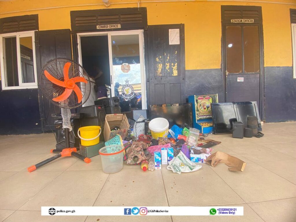At a second location , a yellow house near a cemetery the Police arrested four suspects, including a woman. Exhibits retrieved included dried leaves suspected to be Indian hemp, locally distilled gin known as “akpeteshie,” a 32-inch television set and assorted cigarette brands.