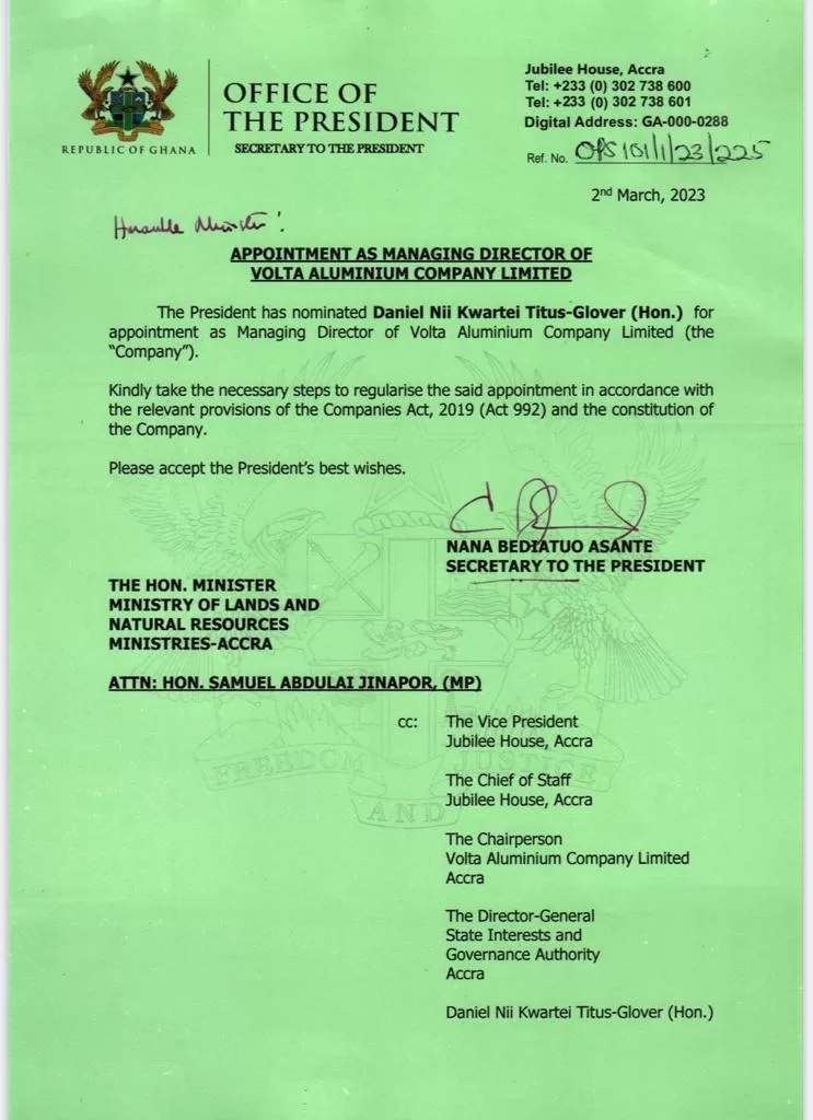 Daniel Nii Kwartei Titus-Glover has been appointed the Managing Director of the Volta Aluminum Company Limited (VALCO).