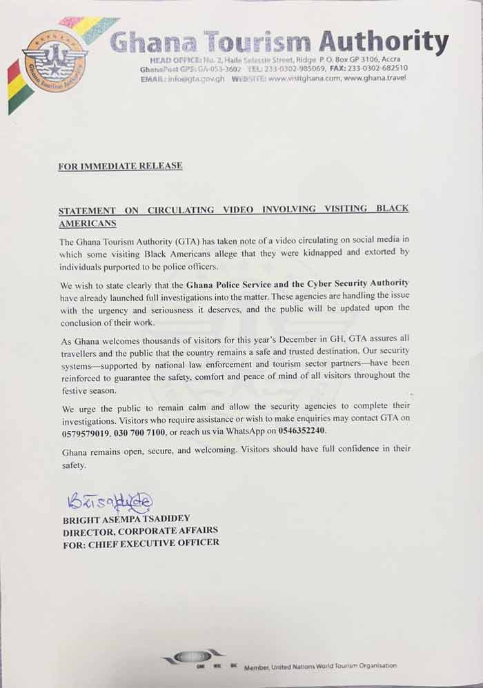 The Ghana Tourism Authority said Monday it is aware of a viral video in which visiting Black Americans allege they were kidnapped and extorted by men claiming to be police officers, prompting swift action from national authorities.