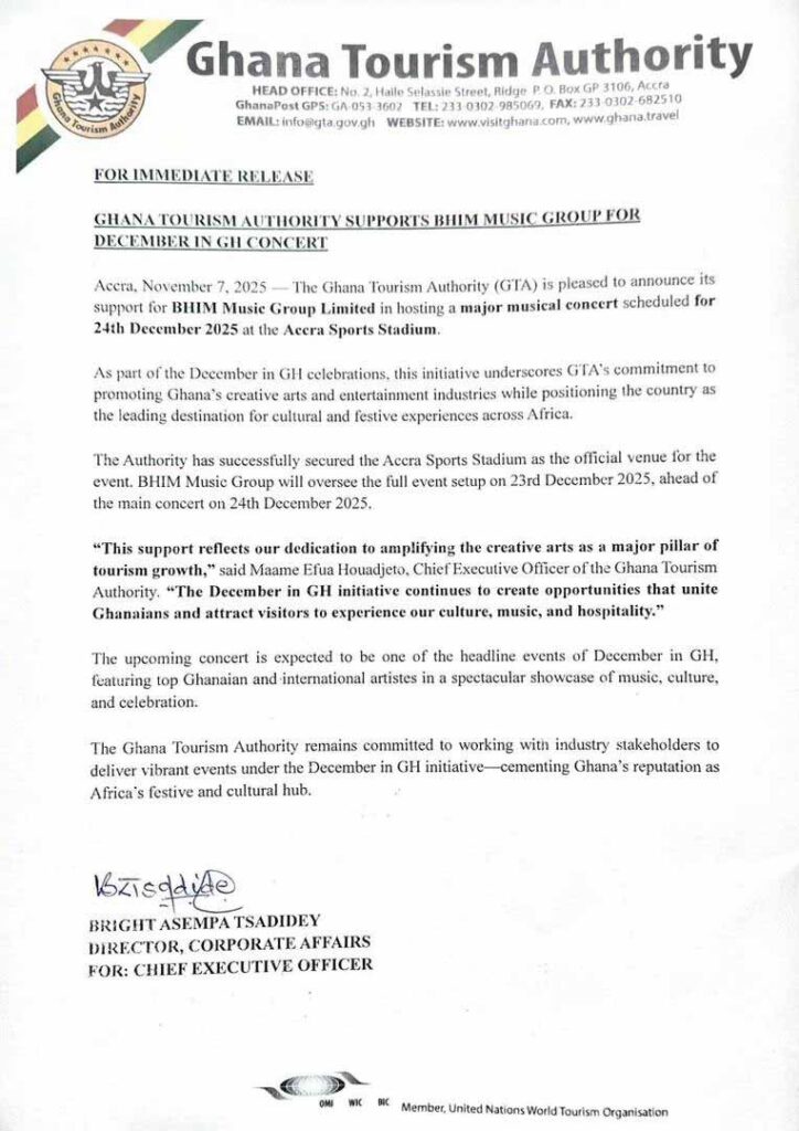 The Ghana Tourism Authority (GTA) has officially confirmed its support for Burniton Music Group as it prepares to stage the much-anticipated BHIM Festival on December 24, 2025, at the Accra Sports Stadium. The festival, one of the biggest highlights of this year’s “December in GH” lineup, is expected to electrify the capital with top-tier performances from leading Ghanaian and international artistes, all celebrating music, culture and unity.