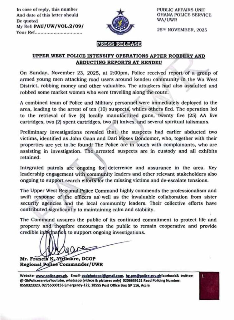 DCOP Francis K. Yiribaare, the Upper West Regional Police Commander, commended the swift response and professionalism of the officers involved, as well as the cooperation of the military and local community members who assisted the operation. He said the coordinated effort played a key role in restoring calm to the area.