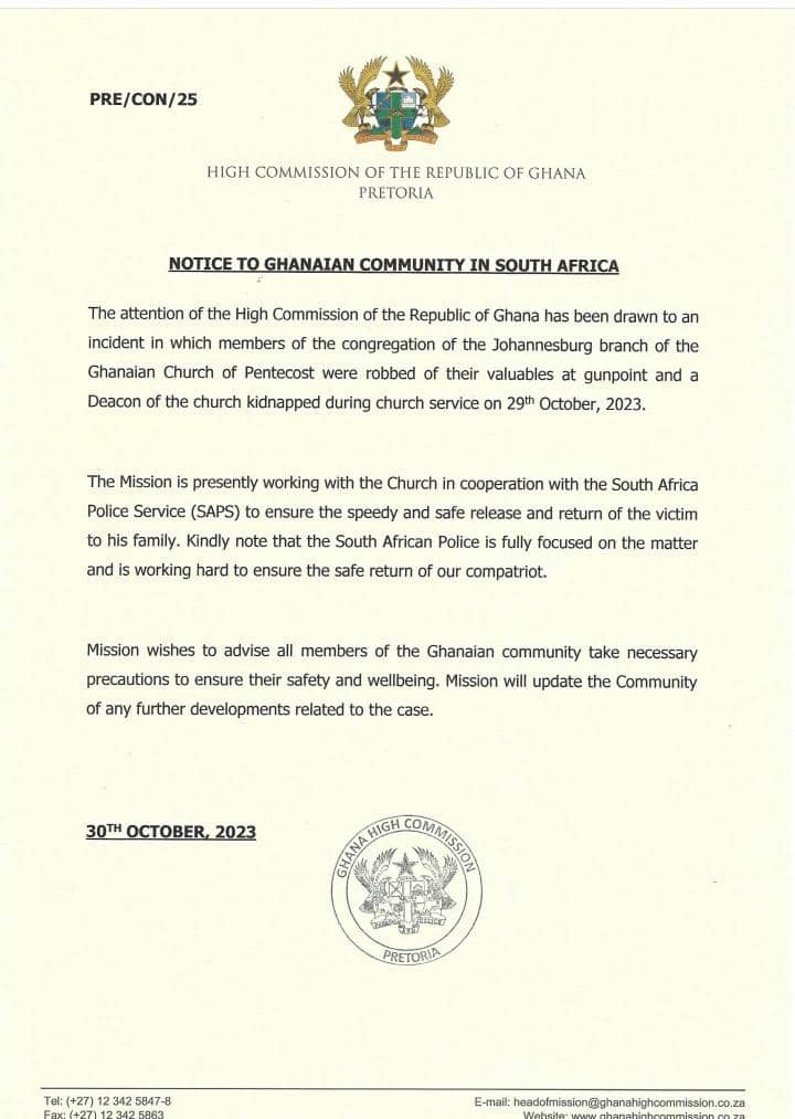 Ghana’s High Commission in South Africa says the police are working hard to ensure the safe release of an Elder of The Church of Pentecost who was kidnapped during a robbery attack on the church.